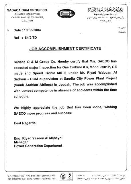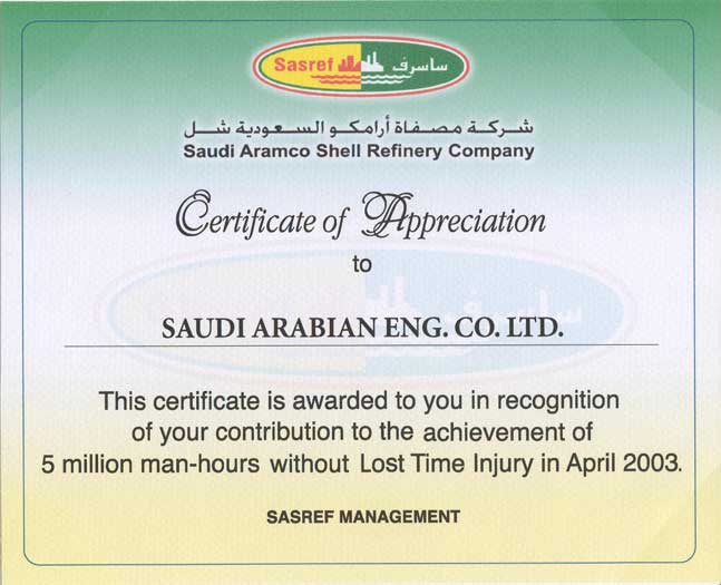 Appreciation Certificate from SASREF for achieving 5 Million Man Hours without Lost Time Injury in April 2003 Turnaround.